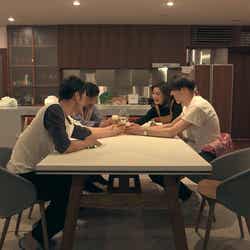 リビングには貴之、翔平、聖南が。「先ほど、付き合うことになりました」と至恩から報告を受け、メンバーも大盛り上がりでカップル誕生を祝福した。