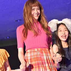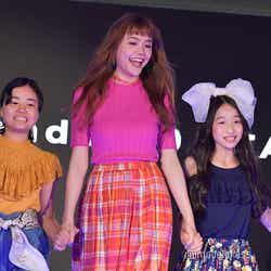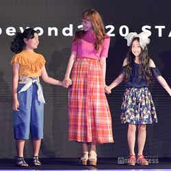 「平和を復興」をテーマにしたTGCビヨンド2020ステージは、ビビットピンクの半袖リブニットに赤チェックのロングスカートを合わせたカラフル×ハッピーなコーディネート。「川俣シルク」のストールをまとった福島県の子どもたちと手をつなぎ、笑顔でランウェイを歩いた。
