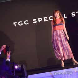 松井は香里奈、土屋アンナらに続き、TGCスペシャルステージに登場。「すべての女性に輝く舞台を」をテーマにした同ステージでは、オレンジのノースリーブトップスを着こなし、先日チェンジしたばかりの明るい茶髪と相まって明るく元気な印象を与えた。