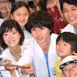 無垢な質問に答えた後の写真撮影は、子どもたちと一緒に実施。ところが、どうしても後ろの山崎に見入ってしまう女の子が、カメラに背を向けてしまうハプニングも。写真撮影、そしてセルフィーも終わり3人が退場する際には、子どもたちから握手攻めにあう出演者たち。それでも、丁寧に握手したり、腰を落として子どもたちの言葉を聞いたり、小児外科医の役と同様に愛情をもって優しく触れ合い、最後まで温かな舞台挨拶となった。