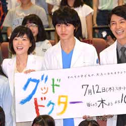 8日、都内でフジテレビ系新木曜ドラマ『グッド・ドクター』(7月12日よる10時スタート※初回15分拡大)の舞台挨拶が行われ、主演の山崎賢人(※「崎」は正式には「たつさき」)、共演の上野樹里・藤木直人が出席した。