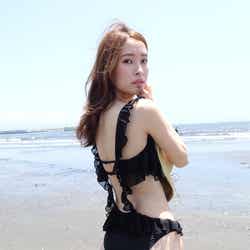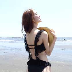今回水野は、注目のバックシャン水着を5つ披露してくれた。(1)クールなボタニカルプリントが目を引くラッフルワンピースは、洗練されたシルエットで大人のボディラインを美しくカバー。バックスタイルはトレンドのレースアップデザインでSNS映え対策もバッチリ。