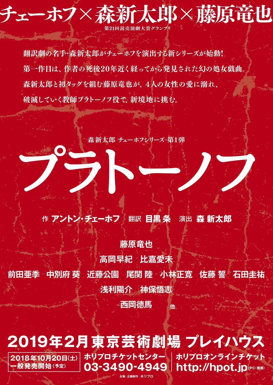 近年、話題の舞台作品を次々に手掛けるホリプロが、翻訳劇の名手・森新太郎氏の演出でチェーホフ作品を上演する「森新太郎 チェーホフ・シリーズ」を始動。第一弾の演目は、チェーホフの生前に上演されることのなかった幻の処女作「プラトーノフ」。タイトルロールの教師プラトーノフを演じるのは、「かもめ」以来、2度目のチェーホフとなる藤原。森新太郎演出作品に出演するのはこれが初めてとなる。