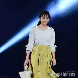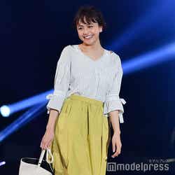 「LOWRYS FARM」ステージのトリを飾った松井は、ストライプシャツにイエローのスカートを合わせた涼し気な夏ファッションを着こなし。