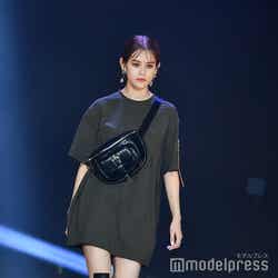 「EVRIS」ステージトリを飾ったemmaは、カーキのミニ丈Tシャツワンピース姿で美脚を披露。ハードなレザーのウエストポーチ、編み上げブーツを合わせたシンプルな中にエッジィな小物を効かせた着こなしでオーラが際立っていた。