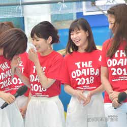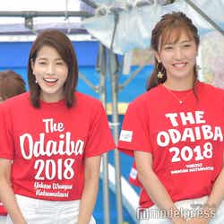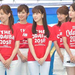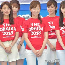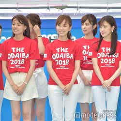 また、「四代目オマツリ男アナ」とともにイベントを盛り上げるべく、女性アナウンサーで結成された「お台場ワンガン娘’18」 (山崎夕貴※「崎」は正式には「たつさき」、竹内友佳、三田友梨佳、久代萌美、宮澤智、内田嶺衣奈、三上真奈、永島優美、小澤陽子、新美有加、宮司愛海、鈴木唯、堤礼実、永尾亜子、海老原優香、久慈暁子、井上清華、杉原千尋)も18人揃って登場。ステージ上では、お台場ワンガン娘’18として、26日に国内最大級の夏フェス「a-nation 2018」(味の素スタジアム/イベントは25日も開催)に出演することを報告した。さらに、三田アナからは「歌とダンスを披露させて頂くのですが、歌は倖田來未さんがカバーして人気が再燃していますラッツ&スターさんの『め組のひと』を和楽器アレンジで披露させて頂く予定です」と紹介。MCの佐野瑞樹アナが“和楽器アレンジ”に引っかかり、「ということは男性陣も?」と投げかけると、榎並アナは「なんとか我々太鼓隊もねじ込ませて頂きました。後ろで粛々と叩かせていただきます」と満面の笑みで返していた。