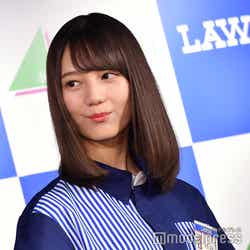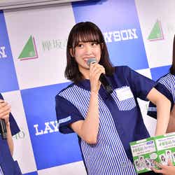 この日は、コンビニエンスストアの制服を着用して登場。メンバーは「すごく可愛い。水色も大好きなので嬉しい!しかも縦ストライプでスタイルが良く見えて。ワクワクしてテンションが上がっています」(菅井)、「人生に一度は着てみたいと思っていました。この衣装を着て歌って踊りたいです」(土生)をウキウキの様子。