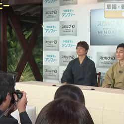 発毛剤のCMということから2人は、おでこ全開で生え際のきわどい兄弟“ミノキ兄弟”を好演。草なぎが兄、香取が弟という設定で「兄さん、すごい発毛剤が出たんだ」「…生えるのか…?」とシュールなやり取りが繰り広げられる。