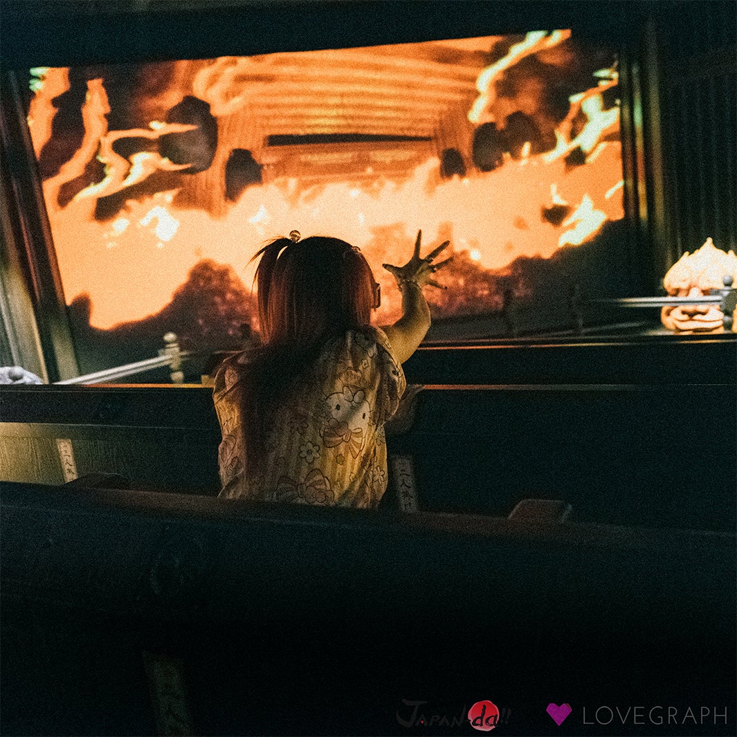 まず体験するアトラクションは「妖怪屋敷」。3D技術によって飛び出してくる浮世絵の中の妖怪たちに思わず椎名は手を伸ばすと、なんと“熱さ”まで伝わるリアルさに大興奮。