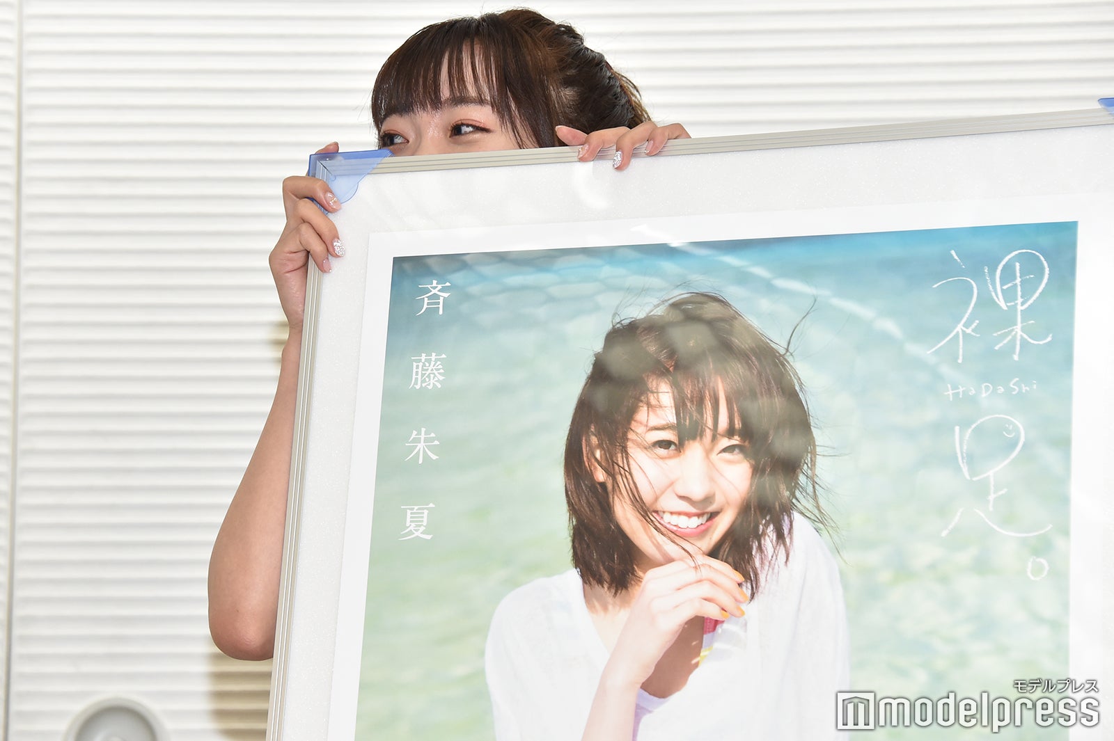 また、水着姿も披露している点についての感想を聞かれると「初めての水着だったのですが、特に恥じらいとかはなく、プライベートで水着を着て海に遊びに行っている感覚だったので、初めての水着でしたけど躊躇なく撮影を楽しんでいました」と語り、「この写真集を撮ったのは21(歳)のときで、21年間分の思いがこの写真集に詰まっていると思うので、この写真集をみれば私のことをすべてわかると思うので、ぜひ見てくれたら嬉しいです」とアピールした。さらに、表紙の帯には斉藤と親交が深いNGT 48の荻野由佳がメッセージを寄稿。「朱夏ちゃんのいつもの無邪気さや、ふとした色っぽさ、普段見せない素顔など、すべてが詰まっていて、親友のわたしが自信を持ってオススメする1冊です!一緒に夢を語り合っていた6年前のふたりにも見せてあげたいな…」と絶賛しているが、本人からも連絡が来そうで「『素敵な1冊だね』って言ってくれましたね」とニッコリ。最近、荻野と直接交流したか尋ねられると「この間、FNS歌謡祭の次の日に、ノリで朝に会おうってなって、2人で朝活をしました」と打ち明けた。