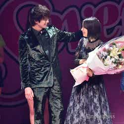 そして、黒のレースドレスにお色直しをした広瀬が入場。卒業を祝うべく、映画「ちはやふる」シリーズなどで共演した俳優の新田真剣佑がサプライズで駆けつけた。広瀬は驚きの表情を浮かべながら、新田とハグ。「急に家族が来たみたいなテンションになっちゃった」と笑みを見せた。