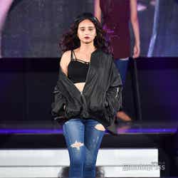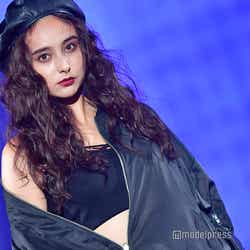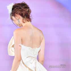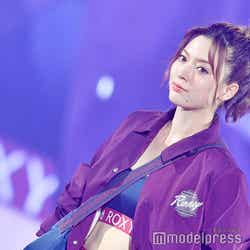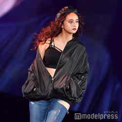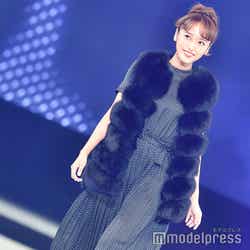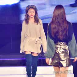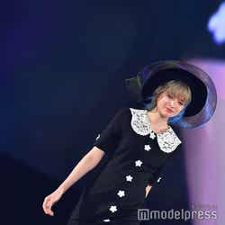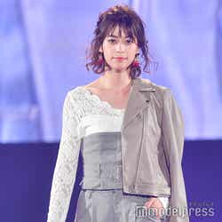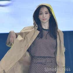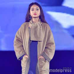 トップバッターは、神コレ初出演の紗栄子。デニムのセットアップドレスを着こなし、引き締まったウエストを披露。ヘアスタイルはロングの三つ編みに花を飾り付けたゴージャスな装いで、持っていった花束の花を渡す演出で盛り上げた。