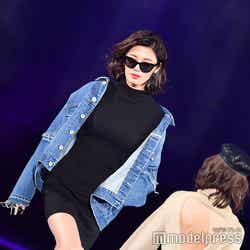 黒のミニワンピースにオーバーサイズのデニムジャケットを羽織ったラフなコーディネートで颯爽とランウェイに登場した島袋。