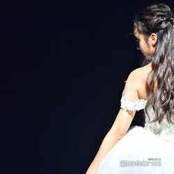 マグノリアホワイトのスペシャルステージに、ウエディングドレス姿で登場。ドレスはバストの形が際立つオフショルダーのデザインで、デコルテと谷間を大胆に披露。チュールスカートからは美脚も透け、抜群のスタイルで色気を放出した石田。ステージで神々しいほどの輝きを放っていた。