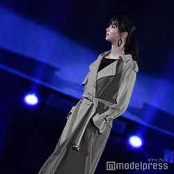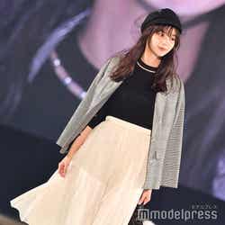 「QUEENS COURT」ステージのトップバッターを飾った新川は、ブラックのトップスにプリーツスカート、トレンドのチェック柄ジャケットを羽織り、ブラックのキャスケットを合わせた秋らしいコーディネートを着こなし。
