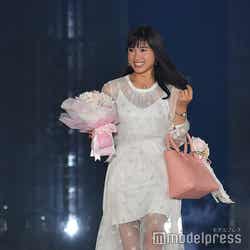 シークレットゲストとして、土屋太鳳が登場。美脚とデコルテが透ける白のチュールワンピを纏い、花束を片手にランウェイをウォーキング。会場の声援に手を振って応え、笑顔あふれるステージを届けた。大盛り上がりのアーティストライブ