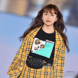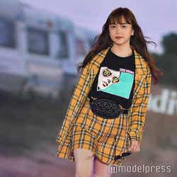 「Stradivarius」ステージのトップを飾った松井。イエローのチェック柄のジャケット×スカートに、ウエストポーチを合わせ、秋のトレンドを取り入れた着こなしを披露した。