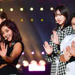 初出演となるTWICEは、海外アーティストとしては初のオープニング出演。大型ビジョン前にたたずむメンバーの姿が見えると、オープニングから会場のテンションは最高潮となった。2017年のトレンドとしてTTポーズが社会現象ともなった『TT -Japanese ver.-』でライブがスタート。メンバーは美脚やウエストが見えるモノトーンの衣装で、息ぴったりのダンスとキュートな歌声で盛り上げた。