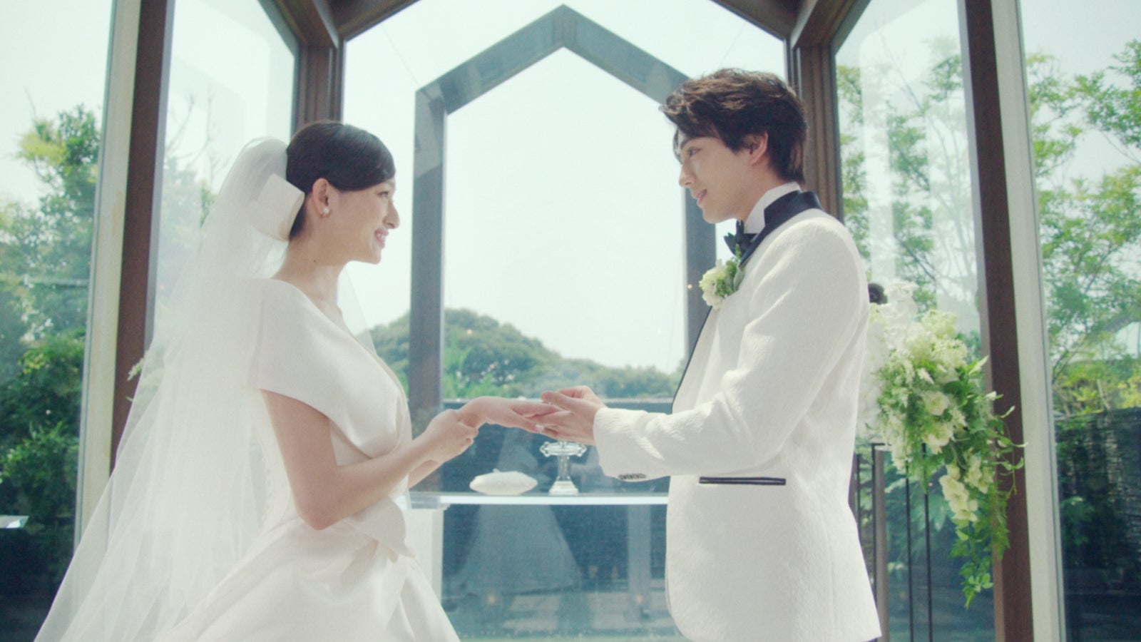 CMは披露宴を終え、さまざまな小道具やお祝いの品など、沢山の荷物を抱えながら歩く、新郎(新田)と新婦(吉川)のシーンから始まる。数時間前まで親族や友人に祝福され、賑やかな時を過ごした主役2人は、無事に式を終えた安堵感、達成感を全身で感じながら、これまで費やした自分たちの頑張りを、ふと思い出す。中には、互いの相性の良さを再確認するような思い出や、本当にやっていけるのだろうかと不安になるような瞬間も。