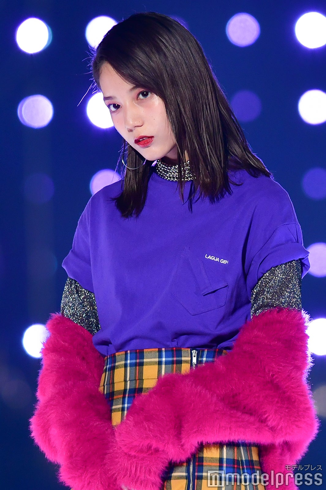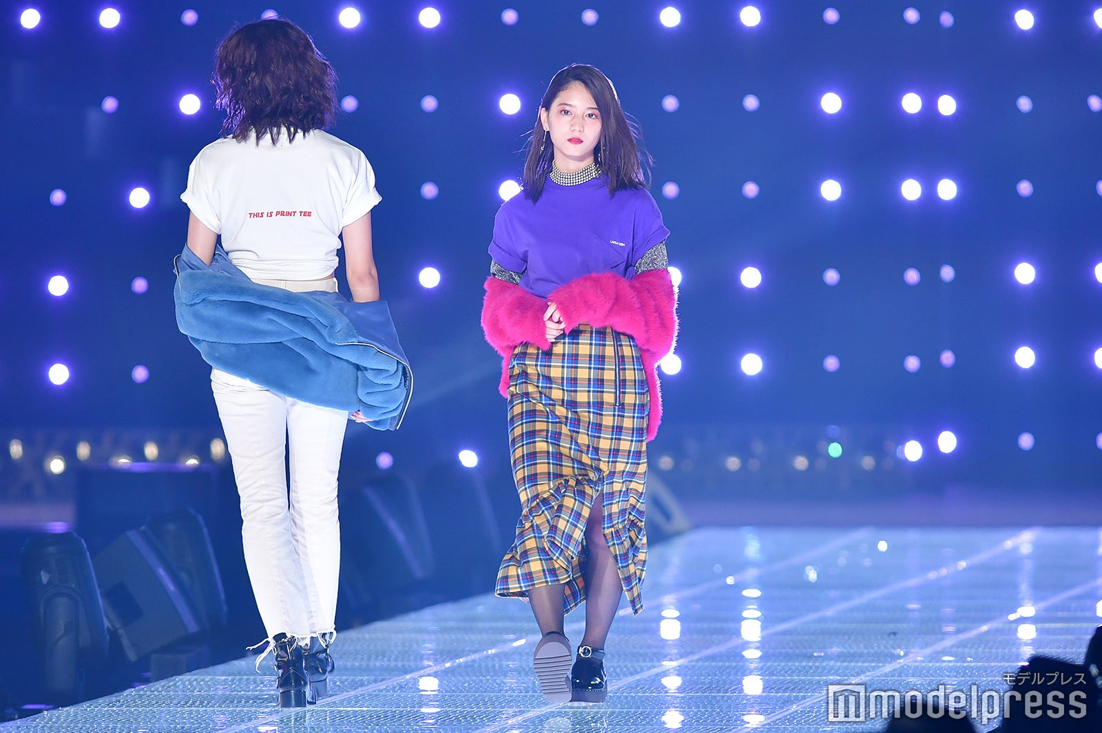 「LAGUA GEM」ステージにて、パープルのトップスにビビッドピンクのファーカーディガンをルーズに羽織り、ボトムはイエローベースのチェックスカートをチョイス。ストリート感のあるカラフルなスタイリングで魅了した。