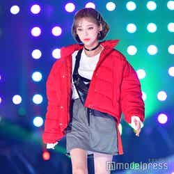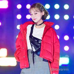 テリは、「WEGO」ステージに登場。白のトップスにタイトミニスカート、オーバーサイズの赤いダウンジャケットを羽織ったトレンドの“オーバーストリート”な着こなし。ウインクしながら舌をぺろっと出すキュートな仕草で悩殺した。