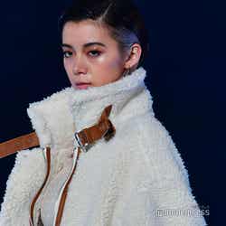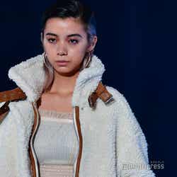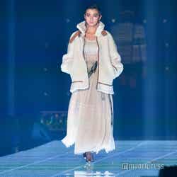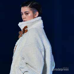 「snidel」ステージのラストに登場した池田は、デコルテがあらわになったチュールワンピースにボアジャケットを合わせた着こなしでクールにランウェイ。ヘアはインナーカラーのシルバーがのぞくオールバックスタイルでキリッと決め、男前な圧巻のステージを届けた。