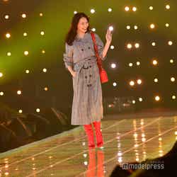 「And Couture(アンドクチュール)」ステージにてトップを飾った大政は、チェック柄のトレンチコートを着こなし。ブーツとショルダーバックに、鮮やかな赤を差し色とした大人可愛いスタイルを披露した。