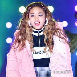 ピンクのダウンにチェックのスカートというコーディネートを着こなし、ウェーブヘアとグリッターが輝くアイメイクが目を引くスタイルで「WEGO」ステージに登場したねお。