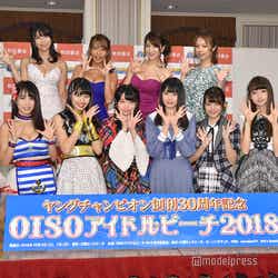 ヤングチャンピオン創刊30周年記念『OISOアイドルビーチ2018』プレス発表会が25日、都内で行われ、STU48の瀧野由美子、AKB48の久保怜音、アップアップガールズ(仮)の佐保明梨、LiKEのバウエル ジゼル愛華、LaLuce/シュークリームロケッツの長月翠、ワンダーウィードの佐倉ちひろ、sherbetの犬童美乃梨、ヤンチャン学園音楽部の河路由希子、グラビアアイドルの菜乃花、鈴木ふみ奈、橋本梨菜、森咲智美が出席した。