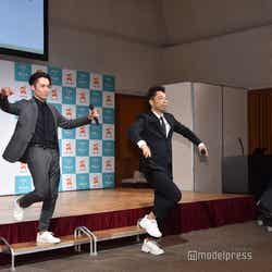 この日のファッションについて聞かれると、TETSUYAは「僕たちもいい大人になってきまして(笑)、スーツを着て出かけることも多くなっていまして、そのときにいつでもどこでも踊りたいなという気持ちにもなるので、(スーツを)スニーカーに合わせるということがポイントになってくると思うんですけど、そんな中で、今日みたいにくるぶしより上の丈だったり、細身だったりはスニーカーに合わせやすくて、全体的にスッキリして見えるスタイルは好きなので、今日みたいなスタイルはいい感じですね」と笑顔を見せ、USAは「自分も普段からスーツスタイルにスニーカーはやるんですけど、スーツの丈を少し工夫するだけですごく合わせやすくなったり、仕事に行くときもスニーカーを履いて、カバンに革靴を入れるのもカッコいいなって思います。スタイリッシュ+動きやすさがポイントですね」と紹介した。イベントでは、USAの新たなチャレンジ“Dance Earth Walk”も発表され、USAは「より歩くということを楽しんでいただけるように、“Dance Earth Walk”という音楽体感型ウォーキングダンスを考えている途中です」と告白。オカザえもんにダンスのレクチャーをし、3人で同ウォーキングダンスの一部を披露した。(modelpress編集部)
