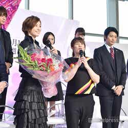 会見には、ゲストとして女子レスリングの吉田沙保里も登場。吉田は米倉に花束を渡し、エールを贈った。吉田は対面した米倉の印象を「キレイで圧倒されています」とコメント。一方で米倉は「思ったよりも小柄。この方が206連勝ということにびっくりしています」と目を丸くしながらも、尊敬の眼差しを向けた。