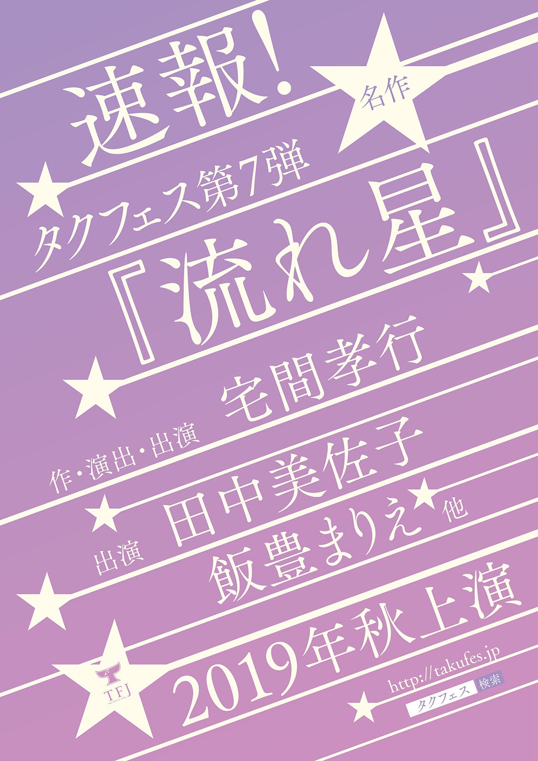 2019年秋上演の第7弾タクフェス公演となる同作。2006年初演、2009年再演した、東京セレソンデラックスの代表作でもある「流れ星」を上演する。