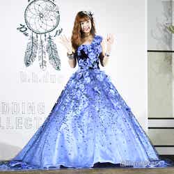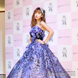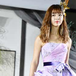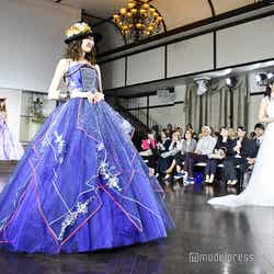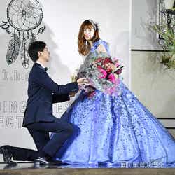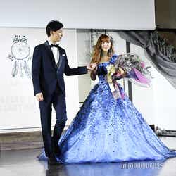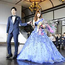 自らモデルとなりドレスをお披露目した藤田。1着目では背中を大胆に露出し、大人の雰囲気を見せつけた。その後、わずか3分で早着替えを終えて、ネイビーのワンショルダーのドレス姿を披露。「ウェストはわりと自信がありまして、週に2回くらいジムで鍛えています」とニヤリ。腹筋の状態について尋ねられると、「割れています!」と声を弾ませた。理想のプロポーズについては、夜景が見える場所でのロマンティックなプロポーズというよりは、日常の中で「結婚しちゃう?」などと言われたいと告白。「しちゃう?」と聞いてほしいそうで、「さらっと、とんでもないことをしてほしいです」と乙女心を弾ませた。