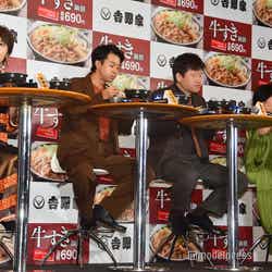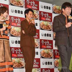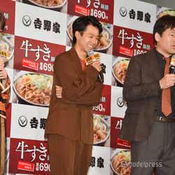 佐藤、太賀、若月は前回のCMに続いて起用。福田雄一監督によるパロディCMは大きな話題を呼んだ。イベントでは今回もメガホンをとった監督からのメッセージVTRを放映し、福田監督の口から「太賀と若月に関しては、今回起用する予定はなかったんですけど、年契(年間契約)みたいで」といきなり聞きたくなかった情報が。「スターダストと吉野家とソニーの間で年間契約が結ばれていたらしく出さなきゃいけない空気に。それを前提に考えたところ、こんな面白いCMができました」と続き、太賀と若月は前のめりでモニターに「何で!?」「ひどいっすね」とツッコミ。佐藤も「“年契”とか言うな!」と叫び、会場は笑いに包まれた。