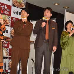 31日、都内にて牛丼チェーンの新商品発表会が行われ、11月1日より公開するCMに出演する俳優の佐藤二朗、太賀、乃木坂46若月佑美、女優の池谷のぶえが登壇した。