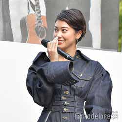 「繊維の町・大阪」にちなんだデニムファッションショーに、オールデニムのドレスで登場。ショートパンツからは美脚を大胆にみせ、観客の視線を集めていた。