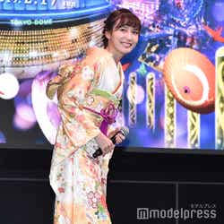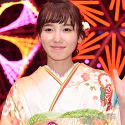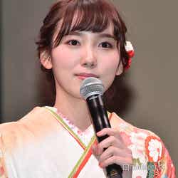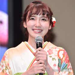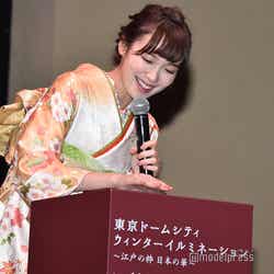 同イルミネーションに合わせた着物姿の飯豊が登場すると、集まった女子高生から黄色い声援が。手を振って応えた飯豊は「イルミネーションに合うように、色鮮やかなお着物を選びました。ここ(帯)に菊のお花もあります。振袖を着てイベントに出るのは初めてなので、すごく嬉しいです」と笑顔を見せた。