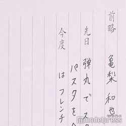 そして、会見では亀梨が佐藤に、佐藤が本田に、本田が亀梨に手紙を書く企画も実施。佐藤は「先日は来てくれてありがとうございます。今度お会いする時もぜひ来て下さい」とメッセージをしたためるも、当の本田は「身に覚えがありません」とポカン。佐藤自身も「分からないと思います」と説明をはじめ、「翼ちゃんはすごい来るんです、来てくれるんです。以前ご一緒した映画のときも、撮影中に僕と山田(涼介)くんと話していて、その時に(本田が)めっちゃ笑顔で走って来て、『なんだろう?』って思っていたら、何でもなかったんです。それがすんげーキュートで、でも何にもない(笑)。今回は顔合わせの時、ロの字にテーブルがある会議室の向かい側だったんです。走って来て『おはようございます』ってめっちゃ笑顔で」と本田の“来るエピソード”を披露。「それがすごいキュートなので、今2作品連続で来ているので、次ご一緒する時もぜひ来て頂きたい」と願望をのぞかせた。(modelpress編集部)