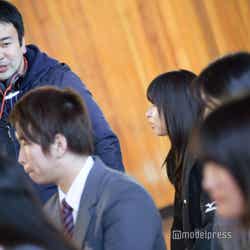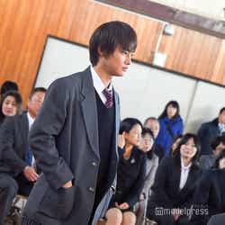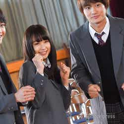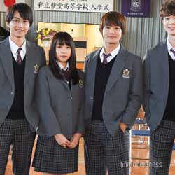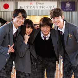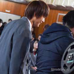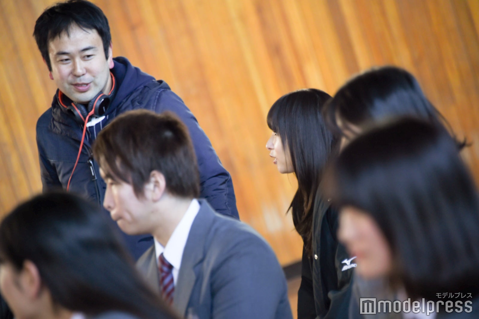撮影では、宮沢ふんする昂が女子生徒たちに向かって「悩んだとき、この言葉をつぶやいてほしい…『ラブ、昂サマ』」と語りかけるカットからスタート。昂のキザでド派手なキャラクターを一瞬で印象付ける重要なシーンだったが、宮沢は低音ボイスの良く通る声で魅力的に昂サマを熱演。エキストラの女の子たちも、ものすごい勢いで「きゃー!」と騒いでいた。また続いて撮られたのは、繭の新入生代表の挨拶シーン。大勢の人々が見つめる中で逞に向かって“絶対に離れない宣言”を行う繭こと桜井は、最初から大声で堂々とした演技を。その場の空気感に耐えられなくなった逞が体育館から逃げだすカットでは、野村が桜井の言葉が全て言い終わる前に駆け出し、桜井が思わず「…って、こら~!」と、ノリツッコミも。すでに掛け合いのタイミングがバッチリな2人だった。