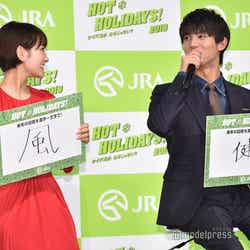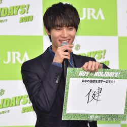 また、朝ドラ『わろてんか』で松坂と夫婦役を演じた葵は、今回の撮影で印象が変わったか尋ねられると「時代設定も違うので、普通のことだと思うんですけど今回の撮影で見たときは普通にイケてるお兄さんって感じで、朝ドラを撮っているときは時代物で着物だったり、関西弁だったり、ちょっと役柄も優しくてバリバリって感じではない部分もあったので、(今回は)輝いて見えました(笑)」と胸の内を明かした。さらに、来年の目標を漢字1文字で表現する企画も行われ、“風”と書いた葵は「来年の目標は風邪を引かないことで、私も健康が好きで健康になろうと頑張っているんですけど、絶対年に1回は風邪を引いちゃうんです。今年もそんな感じだったので、来年こそは1回も風邪を引かずに元気に過ごしたいなって思っていますし、早そう感じがするのもいいのかなあと思って、風が吹く1年になりますようにってことで風にしました」と説明し、“健”と書いた中川は「まさかのちょっと被るという…(笑)。僕も健康に行きたいなと思いまして今年の下半期は月1で風邪を引きまして、ちょっとヤバいなと思ったので、来年は食生活とか、睡眠のサイクルとか、1年元気に過ごしたいな。果汁が出せるように元気に頑張りたいです」とコメント。