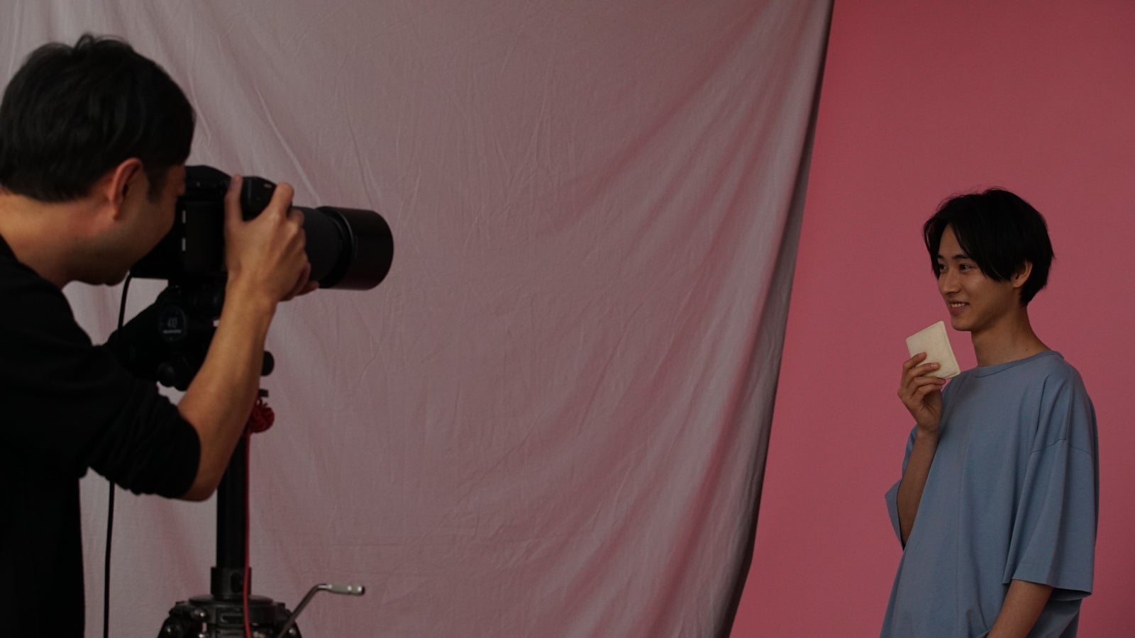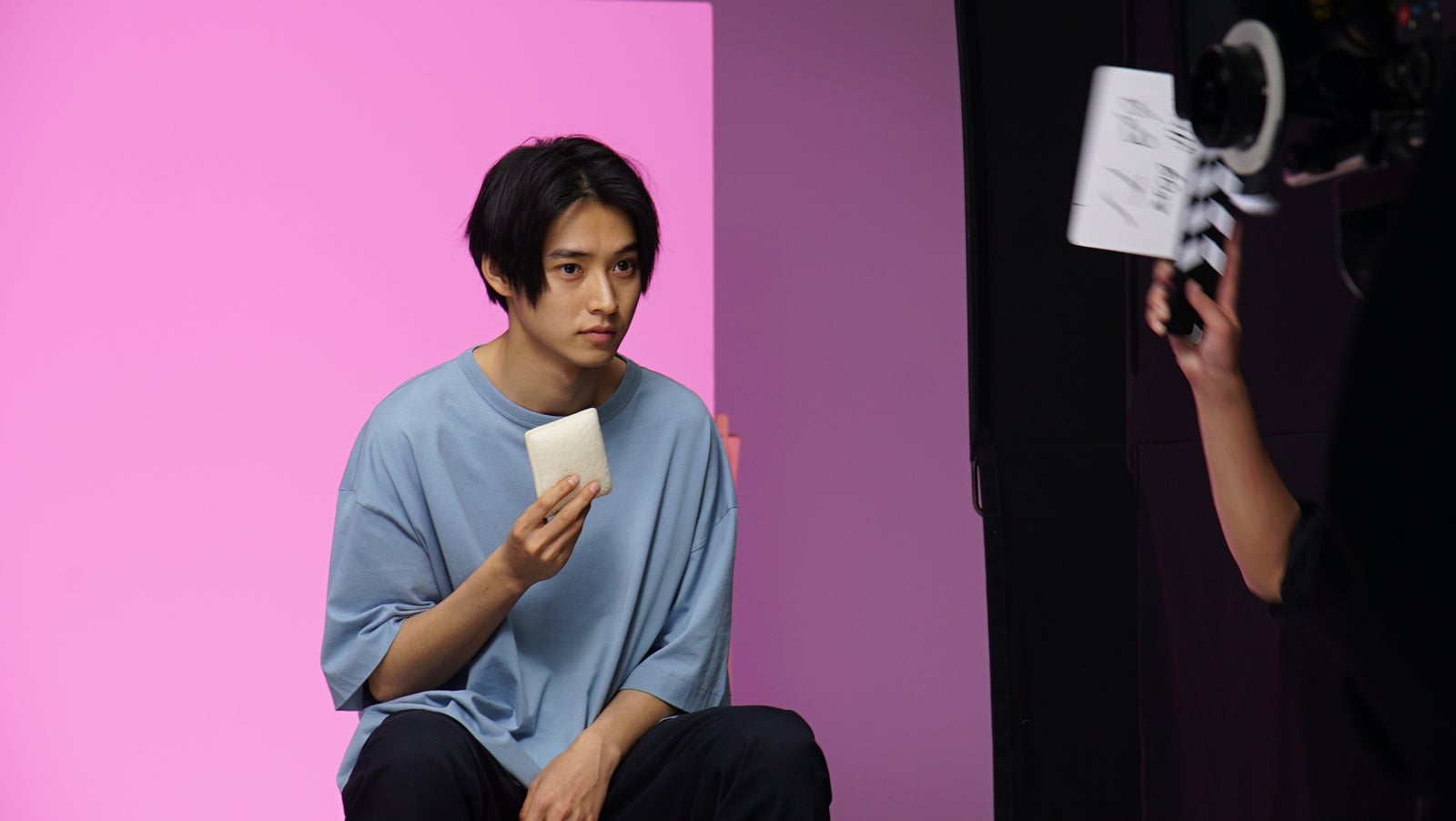 6種類の商品を、6種類の異なるシチュエーションで撮影した今回、山崎にはそれぞれの違いやイメージを、表情とアクションだけで演じ分ける、難しい芝居が求められた。最初の方こそやや緊張の面持ちも見られたが、ワンテイク毎にモニター前へ足を運び、監督と直前のプレイバックを真剣な様子で相談していた山崎。監督からの指示をそのまま言われた通りに演じるだけでなく、時には自分なりに考えて、よりその場の状況にふさわしいアクションを提案していた。