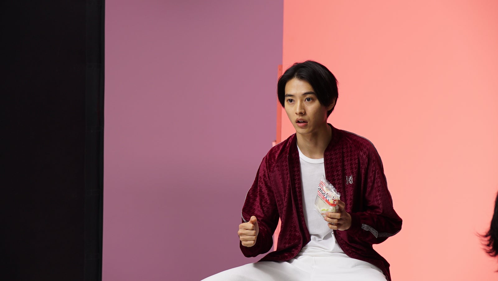 休憩中、撮影用に用意していた出来立てほやほやの商品を見て、「ふわふわしてるー!」と感動していた山崎。調理スタッフから、取り除かれたパンの耳はラスクにしたり、細かいパン粉は飼料にしたりするといった裏話に、「そうなんですか」と興味津々といった様子で耳を傾けていた。山崎賢人、誘惑に負けて思わず…