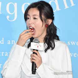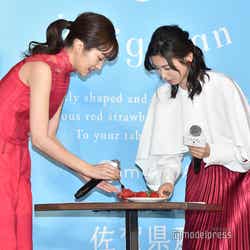 佐賀県が20年ぶりに開発した新ブランドいちご「いちごさん」の世界観と魅力を体験できる同カフェの“お客様1組目”として登場した2人は、それぞれいちごを意識した衣装で登場し、高梨は「靴もいちごのヘタみたいな感じで全身いちごファッションです」と紹介し、本仮屋は「いちごと言えば真っ赤なので、赤(いスカート)と、イヤリングがいちごのようにぷっくりしたみずみずしいものを選びました」とニッコリ。いちごが大好きで2パック食べることもあるという高梨は「いちごが大好きって言い続けてきたので、今日こういう場に呼んでいただけて幸せですし、楽しみにして来ました」と声を弾ませ、同じくいちごが大好きだという本仮屋とともに、同いちごを使ったデザート試食するなど、イベントを楽しんでいた。