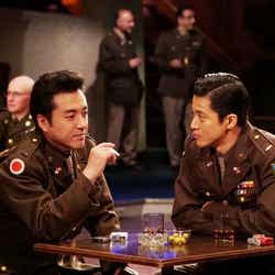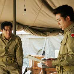 また、賢治と田宮の豪華共演シーンを初解禁。1枚は日米開戦後、アメリカ軍の言語兵のリーダーとしてフィリピンのバギオに渡った賢治と、マッカーサー司令部で中尉となったチャーリーがその戦況について言葉を交わす緊迫のシーン。そしてもう1枚は終戦直後、連合国側の人間として東京裁判の審理をモニターする重責を担った賢治と、マッカーサー元帥の副官にまで上り詰めたチャーリーが将校クラブで顔を合わせるシーン。
