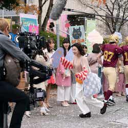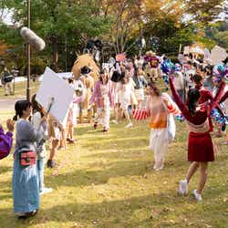 撮影は郊外にある大学で実施。今回の作品の設定が、サークルの新入生勧誘ということで、現場にはチアリーディング部やダンス部、演劇部などさまざまなサークル活動の衣裳をまとった学生役のエキストラが、約70人集結した。撮影中、なまはげの格好をしたエキストラに駆け寄り、ポーズを決めて楽しそうに写真を撮ったり、ひらひらと舞う桜の花びらをキャッチしようとする姿も見られ、永野の天真爛漫な一面が垣間見られた。