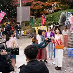 今回、さまざまな格好をした大勢のエキストラに加え、実際の学生が作ったような木材や段ボールで作られた手作り感のある、各サークルの出店ブースや看板のセットが用意された。その様子は実際の大学さながらの雰囲気で、もし自分が大学生だったらというイメージが膨らんだという永野。「こうやってサークル仲間と新入生を勧誘したり、食堂で女子会をしたりするんだろうなと考えていました」と話した。