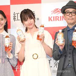 女優の深田恭子と新木優子が12日、都内で行われた新CM発表会にリリー・フランキーとともに登壇した。