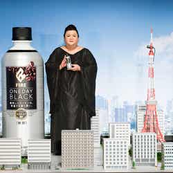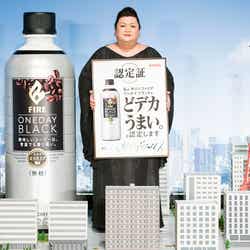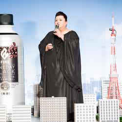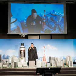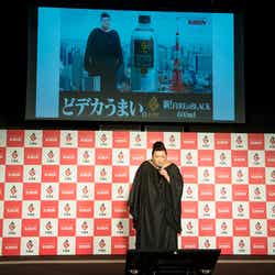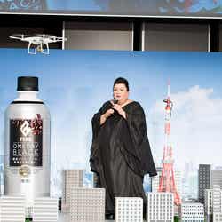商品のキャッチコピーである“どデカうまい”を体験するため、会場に高さおよそ1.8メートルの東京タワーやビル群など東京の街中を再現したジオラマと、巨大ボトルが登場。マツコは豪華なセットと演出に驚きながら、「この(制作にかかった金額の)分、ギャラに回してもらえます?」とジョークを飛ばし会場の笑いを誘った。マツコが司会者に強引に促されるままジオラマの中央に移動すると、マツコが動くたびに足音のSEが流れ出した。次に、巨大なセットとマツコを、ダイナミックなアングルで映し出すドローンが登場。リアルタイムで撮影した映像を、会場の大型スクリーンに投影するという、大掛かりな演出が展開された。撮影された映像は、まるで東京の街を巨大なマツコが進撃しているような迫力ある場面に。マツコは、ジオラマ内の様々な場所に設置されたカメラや多角度からの映像に興味津々の様子。さらにドローンの操縦にも関心を示し、ドローンをわざとマイクで殴るようなふりをして撃墜。それをドローンが巧みに避けると、マツコは「上手ね!」と感心した様子。マツコの動きで会場にはダイナミックな迫力ある映像が広がり、さらに盛り上がりを見せた。