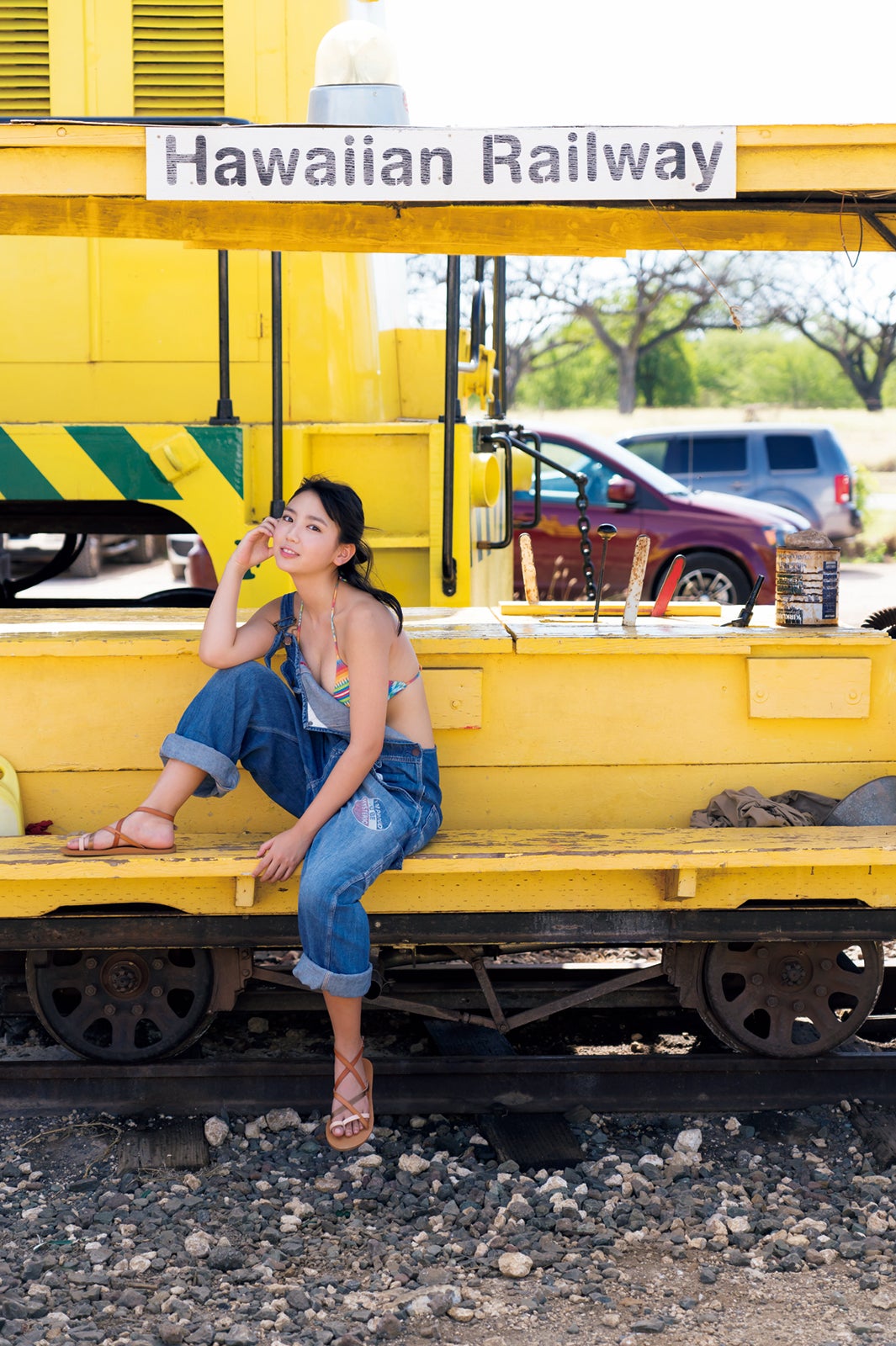 お気に入りのカットには、水着にオーバーオールを合わせたスタイルで、ハワイアン鉄道を散策する姿を収めた1枚をチョイス。「フィーリングで『あ、この表情だ』と思って撮ったのが、この表情だったので、誌面になって見たときは、やっぱりこの表情、イケてたよなって思いましたね」と満足げな表情。