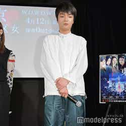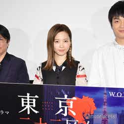 女優の島崎遥香が5日、都内で行われたWOWOW「東京二十三区女」(4月12日深夜12:00スタート)の試写会に、共演の岡山天音・原作者で監督の長江俊和と共に参加した。